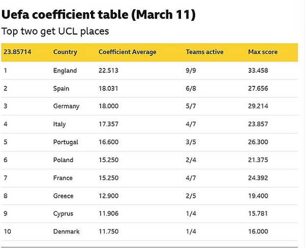 ![]() Chelsea, Man City và Tottenham đã thua thảm ở lượt đi Champions League Từ mùa giải trước, Champions League đã nâng số đội tham dự từ 32 lên 36. 2 quốc gia đứng đầu BXH hệ số của UEFA sẽ được trao thêm 1 suất tham dự. BXH trên được tính theo thành tích của các đội bóng tại Champions League, Europa League và Conference League, với tổng giá trị hệ số được chia cho số lượng đội tham gia. Trong tất cả các giải đấu, mỗi chiến thắng được tính hai điểm hệ số, trong khi một trận hòa được tính một điểm. Ngoài ra còn có điểm thưởng khi vượt qua vòng đấu loại trực tiếp, 1,5 điểm ở Champions League, 1 điểm ở Europa League và 0,5 điểm ở Conference League. Mùa này, Anh đã được trao thêm 1 suất tham dự Champions League. Vì vậy, dù đứng thứ 5 Premier League mùa trước nhưng Newcastle vẫn giành quyền tham dự giải đấu số 1 châu Âu cấp CLB. Anh đang đứng BXH hệ số, với 22,513 điểm, hơn Tây Ban Nha ở vị trí thứ 2 gần 4,5 điểm (18,031) và hơn Đức ở vị trí thứ 3 (18). Họ hiện có 9 đội vẫn còn tham gia các giải đấu châu Âu và đang ở vị trí thuận lợi để giành thêm 1 suất nữa. Tuy nhiên, với những gì các đội bóng Premier League đã thể hiện ở tứ kết lượt đi Champions League, suất thứ 5 dự Champions League đang bị đe doạ. ![]() BXH hệ số của UEFA hiện tại Cụ thể, không đội bóng Premier League nào giành chiến thắng ở lượt trận vừa qua. Tottenham, Man City và Chelsea thậm chí còn đang gặp bất lợi lớn khi lần lượt thua trên sân khách, với các tỉ số 2-5, 0-3 và 2-5. Liverpool thua 0-1 trên sân của Galatasaray, Newcastle hòa Barca 1-1 tại St James' Park. Về phần mình, Arsenal có lợi thế lớn nhất khi cầm hoà Leverkusen 1-1 trên sân khách. Trên thực tế, khả năng Anh văng khỏi top 2 BXH UEFA vẫn thấp. Tuy vậy, không phải chưa từng có tiền lệ. Mùa 2023-24, Anh gần như đã giành được 1 suất tham dự trước khi Arsenal và Man City bị loại ở tứ kết Champions League. Trước đó, M.U và Newcastle đã đứng bét bảng, trong khi West Ham và Liverpool cũng bị Leverkusen và Atalanta hạ gục ở Europa League. |