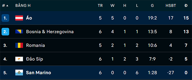 ![]() ĐT Áo đã dễ dàng hủy diệt San Marino với tỉ số 10-0 Ở lượt trận thứ 5 bảng H vòng loại World Cup 2026 khu vực châu Âu, ĐT Áo tiếp đón San Marino tại sân nhà. Đây là cặp đấu quá chênh lệch bởi trước lượt trận này, Áo dẫn đầu bảng H với 12 điểm, trong khi San Marino đã toàn thua cả 5 trận, đứng cuối bảng đấu. San Marino chính là đội tuyển có thứ hạng thấp nhất của bóng đá châu Âu trên BXH FIFA. Đội tuyển này hiện đang xếp hạng 210, kém 188 bậc so với Áo. Vậy nên, không bất ngờ khi thầy trò Ralf Rangnick đã tạo nên chiến thắng hủy diệt với tỉ số 10-0. Ngay trong hiệp 1, với đẳng cấp vượt trội, Áo đã dễ dàng ghi 6 bàn vào lưới San Marino nhờ công của Romano Schmid, Marko Arnautovic, Michael Gregoritsch, Stefan Posch (cú đúp) và Konrad Laimer. Ở hiệp 2, ĐT Áo ghi thêm 4 bàn thắng nữa. Đáng chú ý, tiền đạo lão tướng Marko Arnautovic đã ghi thêm 3 bàn thắng nữa để hoàn tất cú poker ở trận đấu này. Pha lập công còn lại của Áo thuộc về tiền đạo Nikolaus Wurmbrand. Theo thống kê, tất cả cầu thủ đá chính của Áo ở trận đấu này (ngoại trừ thủ môn) đều đóng góp ít nhất 1 bàn thắng hoặc 1 kiến tạo ở trận hủy diệt San Marino 10-0. Đây chưa phải chiến thắng đậm nhất được ghi nhận ở vòng loại World Cup khu vực châu Âu. Cho tới nay, kỉ lục vẫn là trận thắng Cyprus 12-0 của ĐT Đức ở vòng loại World Cup 1970. Dù vậy, với ĐT Áo, đây vẫn là trận đấu đáng nhớ bởi họ đã tạo ra chiến thắng lớn nhất trong lịch sử thi đấu quốc tế. Điều quan trọng là ĐT Áo đã nối dài mạch thắng ở vòng loại World Cup 2026 khu vực châu Âu lên con số 5. Với 15 điểm trọn vẹn sau 5 lượt trận, thầy trò Ralf Rangnick đang dẫn đầu bảng H, hơn 2 điểm so với đội xếp thứ 2 (Bosnia & Herzegovina). Ở lượt trận thứ 6 vào ngày 12/10, ĐT Áo sẽ làm khách trên sân của Romania, đội tuyển đang đứng thứ 3 ở bảng H với 7 điểm. Với màn khởi đầu ấn tượng, ĐT Áo đang đứng trước cơ hội giành vé tham dự VCK World Cup lần đầu tiên kể từ năm 1998. XẾP HẠNG BẢNG H VÒNG LOẠI WORLD CUP 2026 KHU VỰC CHÂU ÂU ![]() |