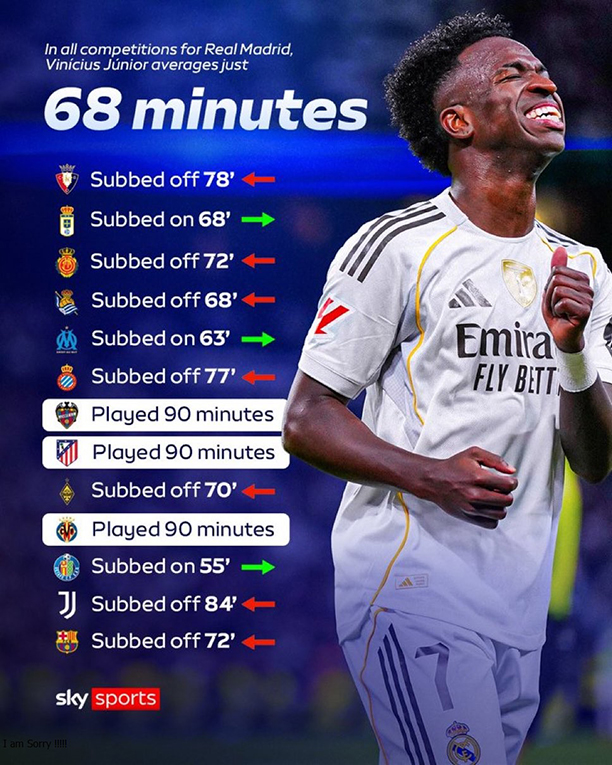 Từ đầu mùa giải này, Vinicius chỉ được đá trọn vẹn 90 phút đúng 3 trận. Đây là lý do khiến tuyển thủ Brazil nổi nóng khi bị thay ra ở El Clasico. |