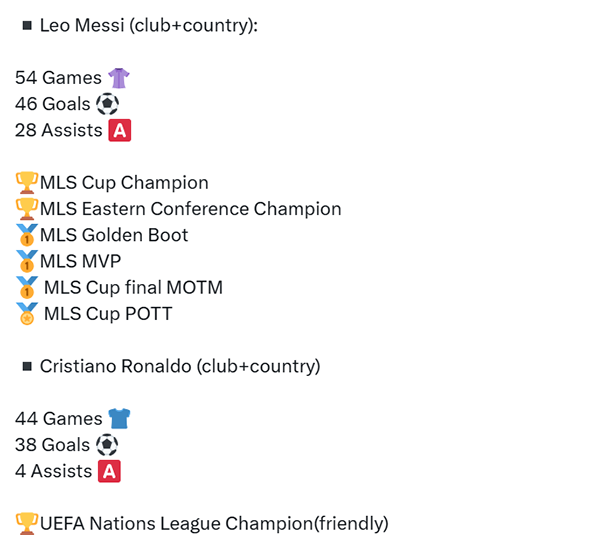 ![]() Ronaldo đứng sau Messsi về thành tích trong năm 2025 Thành tích trong năm nay của Messi và Ronaldo ![]() |