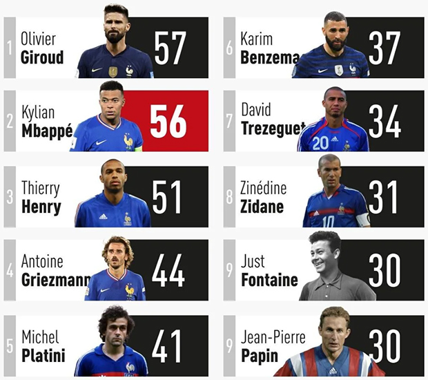 Chỉ cần ghi thêm 1 bàn thắng nữa, Kylian Mbappe sẽ cân bằng kỉ lục ghi bàn của Olivier Giroud ở đội tuyển Pháp. |