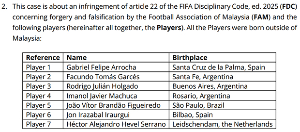 Trong tài liệu 19 trang, LĐBĐ thế giới (FIFA) đã công bố nhiều bằng chứng để khẳng định LĐBĐ Malaysia (FAM) đã gian lận khi đăng kí hồ sơ cho 7 cầu thủ nhập tịch. |