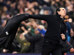 HLV Unai Emery đã bật tung cảm xúc ăn mừng sau khi Morgan Rogers ghi bàn thắng ấn định tỉ số 2-1 trước Man Utd. |