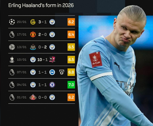 Kể từ năm 2026, tiền đạo Erling Haaland sa sút báo động, anh mới chỉ ghi 1 bàn sau 7 trận cho Man City trên mọi đấu trường. |