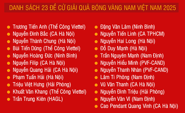 Tổng cộng 23 cầu thủ đã được điền tên vào danh sách đề cử giải Quả bóng Vàng nam Việt Nam năm 2025. Cuộc đua được dự báo rất khó lường bởi không tên tuổi nào quá nổi bật so với phần còn lại. |