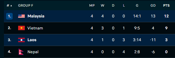 Lào đã gây bất ngờ khi vượt lên dẫn trước trong hiệp 1 nhưng điều đó giống như chọc giận Malaysia. Bùng nổ ở hiệp 2 và ghi liên tiếp 5 bàn, Hổ vàng lội ngược dòng và củng cố ngôi đầu bảng. |