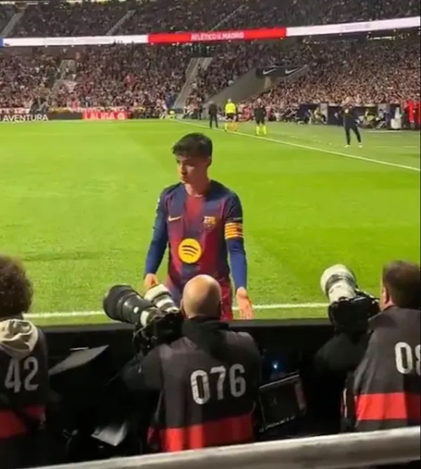 Ở trận thắng Atletico Madrid, tiền vệ Pedri của Barca đã tưởng mái đầu hói của người quay phim thành… trái bóng. |