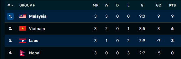 Gặp khó khăn và bất lực trong hiệp 1 nhưng Malaysia ghi liên tiếp 3 bàn ở hiệp 2, qua đó giành trọn 3 điểm trước Lào. Hổ vàng đã khép lại vòng loại Asian Cup 2027 với 9 điểm và đứng đầu bảng F. |