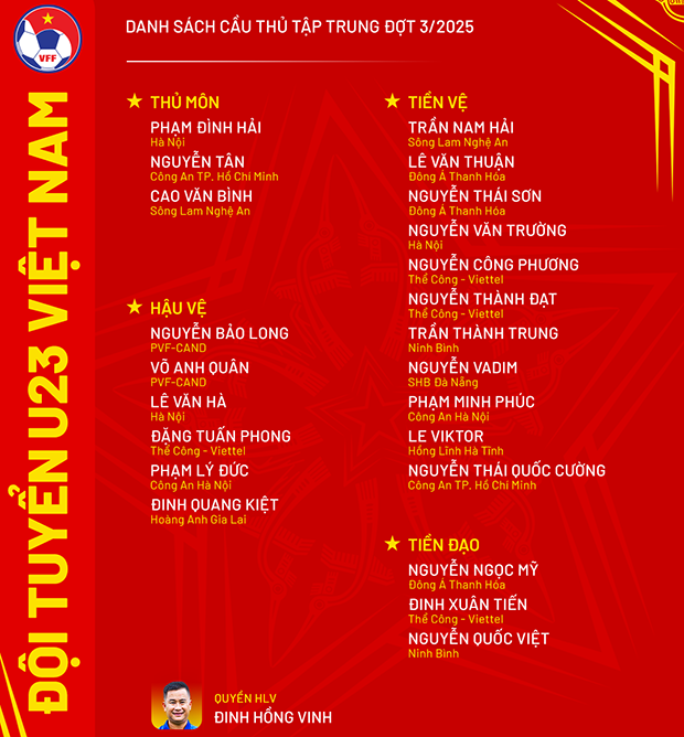 ![]() Nguyễn Vadim lần đầu được triệu tập lên tuyển U23 Việt Nam Chiều nay (30/9), LĐBĐ Việt Nam (VFF) đã công bố danh sách triệu tập 23 cầu thủ lên tuyển U23 Việt Nam. Đây là đợt tập trung nằm trong quá trình chuẩn bị cho SEA Games 33 và VCK U23 châu Á 2026. Điểm nhấn đáng chú ý nhất trong bản danh sách này là sự góp mặt của tiền vệ Nguyễn Vadim. Nguyễn Vadim sinh năm 2005 tại Nga, có bố là người Việt, mẹ là người Nga. Ở tuổi 20, tài năng trẻ này được đánh giá khá đa năng, có thể chơi tốt ở cả vị trí tiền vệ cánh và tiền vệ trung tâm. Đây là tân binh của Đà Nẵng ở mùa giải 2025-26. Đây là lần đầu tiên Nguyễn Vadim được triệu tập lên tuyển U23 Việt Nam. Ngoài tiền vệ này, HLV Kim Sang-sik còn triệu tập 2 cầu thủ Việt kiều khác là Trần Thành Trung (Ninh Bình) và Lê Viktor (Hồng Lĩnh Hà Tĩnh). Ở đợt tập trung trong tháng 10 này, HLV Kim Sang-sik đã đôn một số cầu thủ xuất sắc của tuyển U23 lên ĐT Việt Nam như Trung Kiên, Hiểu Minh, Nhật Minh, Xuân Bắc, Phi Hoàng, Đình Bắc, Văn Khang hay Thanh Nhàn. Vì vậy, ở tuyển U23, đây là cơ hội để HLV người Hàn Quốc thử nghiệm một số nhân tố mới. Danh sách tập trung của tuyển U23 Việt Nam trong tháng 10 vẫn có sự góp mặt của nhiều trụ cột quan trọng đã thi đấu thành công ở giải U23 Đông Nam Á 2025 và vòng loại U23 châu Á 2026 như Anh Quân, Lý Đức, Văn Thuận, Thái Sơn, Văn Trường, Công Phương, Quốc Việt hay Ngọc Mỹ… Theo kế hoạch, U23 Việt Nam sẽ hội quân tại Hà Nội vào ngày 4/10 tới. Tới ngày 7/10, U23 Việt Nam sẽ tới UAE tập huấn. Tại đây, đội sẽ thi đấu 2 trận giao hữu với U23 Qatar vào ngày 9/10 và 13/10. Ở đợt tập trung tới, U23 Việt Nam sẽ được dẫn dắt bởi HLV Đinh Hồng Vinh. Cùng thời điểm HLV Kim Sang-sik sẽ chỉ đạo ĐT Việt Nam tham dự 2 trận đấu thuộc vòng loại Asian Cup 2027 với Nepal vào ngày 9 và 14/10. ![]() |