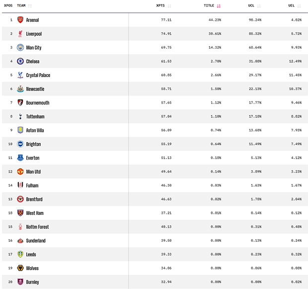 ![]() Sau vòng 7, Opta đánh giá Arsenal là ứng cử viên vô địch EPL số 1 Cuối tuần qua, cuộc đua vô địch Premier League 2025-26 đã tạo ra ngã rẽ mới khi Liverpool tiếp tục để thua Chelsea, còn Arsenal đã giành trọn 3 điểm ở trận derby với West Ham. Với chiến thắng này, Pháo thủ đã soán ngôi đầu bảng của Liverpool với 1 điểm nhiều hơn. Trước khi mùa giải này khởi tranh, Liverpool được Opta đánh giá là ứng cử viên vô địch số 1. Nhận định ấy càng có cơ sở khi thầy trò Arne Slot đã thắng liên tiếp 5 vòng mở màn, trong đó có trận chiến trực tiếp với Arsenal. Tuy vậy, ở 2 vòng đấu gần nhất, Liverpool đã liên tiếp thất bại khi gặp 2 đội bóng London là Crystal Palace và Chelsea. Hai cú ngã này đã giáng 1 đòn mạnh mẽ vào tham vọng bảo vệ ngôi vương nước Anh của thầy trò Arne Slot. Không bất ngờ khi Opta đã thay đổi dự đoán, coi Arsenal là ứng cử viên vô địch Premier League số 1 với xác suất là 44,23%. Đây là con số được phân tích dựa trên phần mềm giả lập dự đoán. Trong khi đó, Liverpool đã rơi xuống vị trí thứ 2 với xác suất là 30,61%. Cũng theo dự đoán của Opta, Arsenal có thể kết thúc Premier League mùa này với điểm số kì vọng là 77,11, hơn khoảng 2 điểm so với Liverpool (74,91). Đứng các vị trí tiếp theo trong top 4 theo dự đoán của Opta là Man City (69,75 điểm) và Chelsea (61,53%). Tottenham đang đứng thứ 3 trên BXH, chỉ sau Arsenal và Liverpool. Nhưng theo dự đoán của Opta, Spurs chỉ về đích thứ 8 với điểm số kì vọng là 57,04. Trong khi đó, M.U được dự báo sẽ về đích ở vị trí thứ 12 với điểm số kì vọng là 49,64. Sau vòng 7, Opta dự đoán 3 CLB sẽ xuống hạng là Burnley, Wolves và West Ham. Đây cũng là 3 CLB đang đứng cuối bảng xếp hạng. Sau 2 thất bại liên tiếp, Liverpool được dự báo sẽ còn tiếp tục gặp nhiều khó khăn trong cuộc đua vô địch bởi sau đợt tập trung ĐTQG trong tháng 10, thầy trò Arne Slot sẽ lần lượt chạm trán Man Utd, Brentford, Aston Villa và Man City. Ngược lại, Arsenal khá dễ thở khi gặp Fulham, Crystal Palace, Burnley và Sunderland ở 4 vòng đấu kế tiếp. Đây là cơ hội để thầy trò Mikel Arteta bứt phá trong cuộc đua vô địch sau khi soán ngôi đầu bảng của Liverpool. DỰ ĐOÁN CỦA OPTA SAU VÒNG 7 PREMIER LEAGUE ![]() |