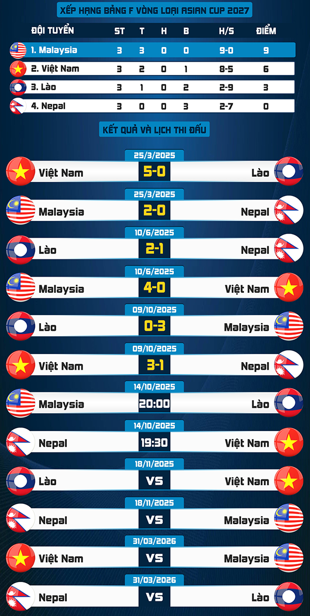 Gặp khó khăn và bất lực trong hiệp 1 nhưng Malaysia ghi liên tiếp 3 bàn ở hiệp 2, qua đó giành trọn 3 điểm trước Lào. Hổ vàng đã khép lại vòng loại Asian Cup 2027 với 9 điểm và đứng đầu bảng F. |