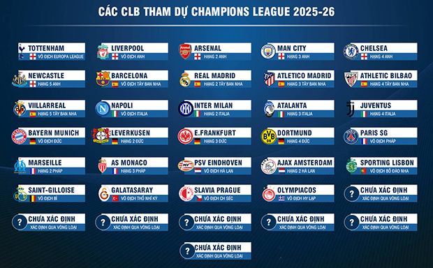 Đã xác định 29/36 CLB dự Champions League 2025-26 |