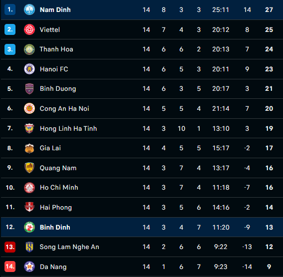Với các bàn thắng của Văn Đạt, Thanh Hào và Văn Vĩ, Nam Định đã đánh bại Bình Định với tỉ số 3-1, qua đó trở lại ngôi đầu V-League sau vòng 14.