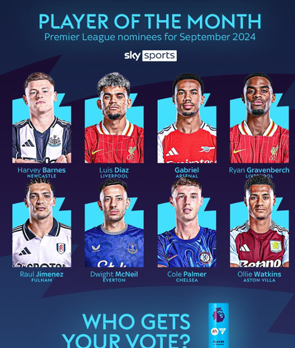 Với những gì đã thể hiện, Cole Palmer được coi là ƯCV số 1 cho danh hiệu cầu thủ xuất sắc nhất tháng 9 Premier League. Nếu được vinh danh thì đây sẽ là lần thứ hai Cole Palmer đoạt danh hiệu này, sau khi lần đầu nhận giải vào tháng 4/2024.