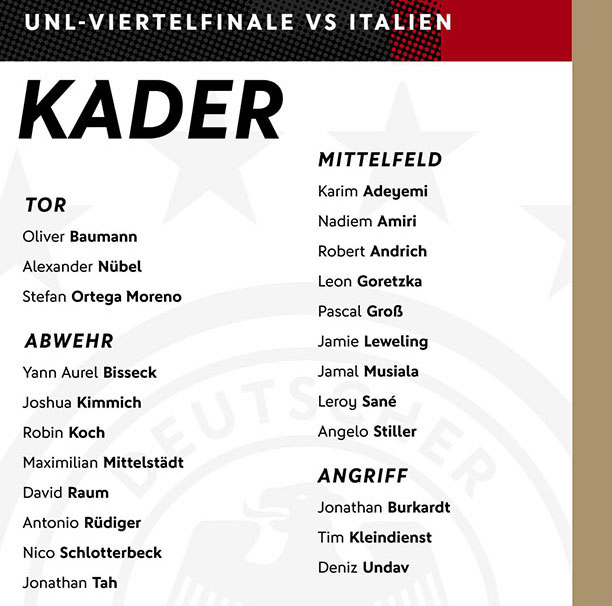 Theo lịch, vào ngày 21 và 23/3 tới, ĐT Đức sẽ thi đấu 2 trận lượt đi và về vòng tứ kết Nations League 2024-25 với Italia. Hơn một tuần trước các cuộc đối đầu với Italia, hôm nay, HLV Nagelsmann đã công bố danh sách triệu tập của Die Mannschaft.