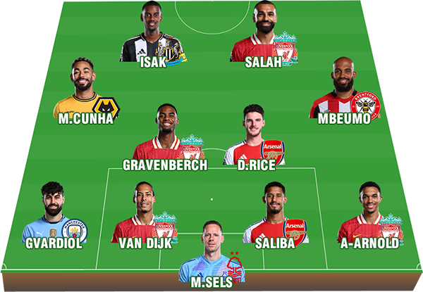 - Bryan Mbeumo (Brentford): Mbeumo đã thi đấu cả 38 trận ở Premier League mùa giải 2024-25, in dấu giày trong 27 bàn thắng (20 bàn, 7 kiến tạo). Dù Brentford chỉ về đích thứ 10 trên BXH, Mbeumo vẫn xứng đáng góp mặt trong đội hình xuất sắc nhất mùa.