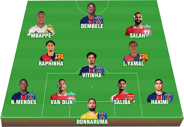 Với cú ăn 3 lịch sử, PSG xứng đáng có 5 ngôi sao lọt đội hình xuất sắc nhất châu Âu mùa giải 2024-25. Ngoài ra, phải kể tới sự góp mặt của nhiều tên tuổi đáng chú ý khác đã tỏa sáng ở mùa giải vừa qua như Mbappe, Salah, Raphinha hay Yamal…