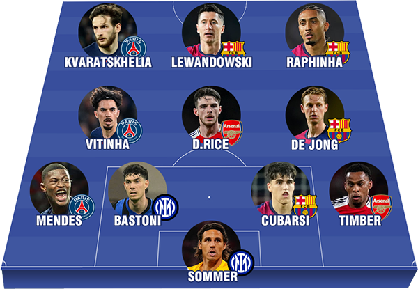 ![]() THỦ MÔN - Yann Sommer (Inter Milan): Bayern đã tung ra 20 cú dứt điểm nhưng chỉ 1 lần xé lưới Inter Milan ở trận lượt đi. Với 7 pha cứu thua, Sommer là 1 trong những cầu thủ gây ấn tượng nhất của Inter Milan ở trận đấu này. HẬU VỆ - Jurrien Timber (Arsenal): Với 4 cú tắc bóng và hàng loạt tình huống truy cản thành công, Timber đã làm tốt nhiệm vụ khóa ngòi nổ Vinicius của Real Madrid. Ngoài ra, hậu vệ người Hà Lan còn hỗ trợ rất tích cực cho Saka ở mặt trận tấn công. - Alessandro Bastoni (Inter Milan): Ngoài 5 cú tắc bóng, Bastoni còn gây ấn tượng ở khả năng điều phối hàng thủ, giúp Inter Milan bảo vệ chiến thắng 2-1 trên sân của Bayern Munich. Sau trận, trung vệ người Italia đã được UEFA trao giải cầu thủ xuất sắc nhất. ![]() - Pau Cubarsi (Barca): Không chỉ giúp Barca giữ sạch lưới ở trận lượt đi, Cubarsi còn đóng góp 1 kiến tạo. Từng đó là đủ để tài năng trẻ 18 tuổi này góp mặt trong đội hình xuất sắc nhất lượt đi. - Nuno Mendes (PSG): Mendes mắc lỗi dẫn tới bàn thua của PSG. Nhưng sau đó, hậu vệ người Bồ Đào Nha đã tỏa sáng với 1 bàn thắng và 1 kiến tạo. Nhờ đó, đội bóng thủ đô Paris đã ngược dòng giành chiến thắng thuyết phục với tỉ số 3-1. TIỀN VỆ - Declan Rice (Arsenal): Trận lượt đi tứ kết với Real Madrid là show diễn để đời của Declan Rice bởi anh đã bất ngờ tỏa sáng với 2 siêu phẩm sút phạt. Đây là sự khác biệt giúp Arsenal giành ưu thế rất lớn trước trận lượt về ở Madrid. ![]() - Vitinha (PSG): Tung ra 152 đường chuyền với tỉ lệ chính xác lên tới 97,4%, Vitinha đã giúp PSG tạo ra thế trận lấn lướt hoàn toàn Aston Villa ở trận lượt đi. Kết quả, đội bóng của Ligue 1 đã ngược dòng giành chiến thắng với tỉ số 3-1. - Frenkie De Jong (Barca): Không chỉ thể hiện tốt vai trò kiến thiết lối chơi, De Jong còn gây ấn tượng với 4 cú tắc bóng và 2 tình huống truy cản thành công. Nhờ đó, Barca đã thắng thuyết phục Dortmund và không để lọt lưới (4-0). TIỀN ĐẠO - Robert Lewandowski (Barca): Bùng nổ với cú đúp bàn thắng, Lewandowski đã giúp Barca dễ dàng đè bẹp Dortmund 4-0 ở lượt đi tứ kết. Tiền đạo người Ba Lan xứng đáng được UEFA vinh danh với giải cầu thủ xuất sắc nhất trận. ![]() - Khvicha Kvaratskhelia (PSG): Tốc độ và kĩ thuật của Kvaratskhelia đã gây ra rất nhiều khó khăn cho hàng thủ của Aston Villa. Ngoài bàn thắng nâng tỉ số lên 2-1, tiền vệ người Georgia còn tạo ra 5 cơ hội khác cho hàng công của PSG. Anh đã được UEFA trao giải cầu thủ xuất sắc nhất trận. - Raphinha (Barca): Chiến thắng tưng bừng 4-0 của Barca trước Dortmund còn in đậm dấu ấn của Raphinha, người đã ghi 1 bàn thắng và đóng góp 2 kiến tạo. Với 12 bàn, Raphinha đang dẫn đầu cuộc đua Vua phá lưới. Ngoài ra, anh còn gây ấn tượng với 7 kiến tạo ở sân chơi số 1 châu Âu mùa này. |