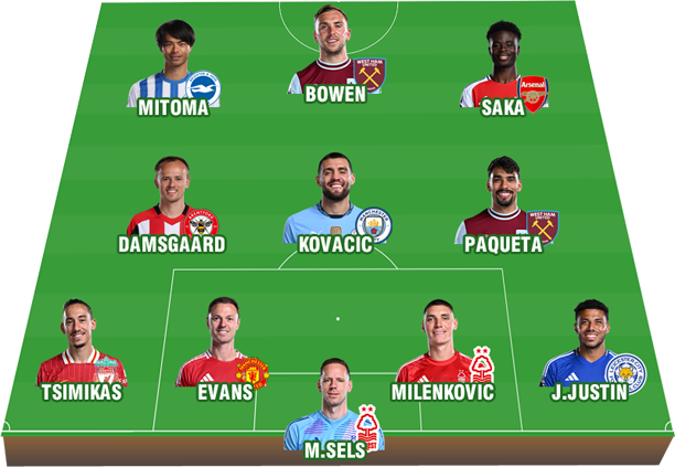 ![]() THỦ MÔN - Matz Sels (Nottingham Forest): Nottingham Forest đã xuất sắc cầm hòa Chelsea với tỉ số 1-1 ở vòng 7 Premier League. Trong đó, thủ thành Matz Sels là người gây ấn tượng mạnh nhất với 7 tình huống cứu thua. HẬU VỆ - James Justin (Leicester): Không chỉ giúp Leicester giữ sạch lưới, Justin còn kiến tạo bàn thắng duy nhất cho Bầy cáo ở trận thắng Bournemouth. Đây cũng là chiến thắng đầu tiên của The Foxes ở Premier League mùa này. - Nikola Milenkovic (Nottingham Forest): Milenkovic chính là người kiến tạo bàn mở tỉ số cho Nottingham Forest ở trận đấu với Chelsea. Ở mặt trận phòng ngự, trung vệ người Serbia cũng gây ấn tượng mạnh, khiến mạch thắng của The Blues dừng lại ở con số 3. ![]() - Jonny Evans (Man Utd): Ở trận đấu hòa Aston Villa 0-0, Evans đã thực hiện 4 cú tắc bóng và thắng 8/9 tình huống tranh chấp. Anh xứng đáng được BTC trao giải cầu thủ xuất sắc nhất trận. - Kostas Tsimikas (Liverpool): Được xếp đá chính thay Robertson, Tsimikas thi đấu khá ấn tượng trong cả tấn công lẫn phòng ngự. Đường chuyền tinh tế của hậu vệ này đã mở ra bàn thắng duy nhất của Liverpool ở trận thắng Crystal Palace. TIỀN VỆ - Mateo Kovacic (Man City): Trong vai trò tiền vệ tổ chức, Kovacic bất ngờ tỏa sáng với cú đúp ở trận thắng Fulham 3-2. Từng đó là đủ để tiền vệ người Croatia góp mặt trong đội hình tiêu biểu của vòng 7. ![]() - Mikkel Damsgaard (Brentford): Với 5 bàn thắng, Brentford là đội bóng bùng nổ nhất ở vòng 7 (thắng Wolves 5-3). Trong đó, tiền vệ Damsgaard gây ấn tượng với 2 kiến tạo và hàng loạt đường chuyền tạo cơ hội. - Lucas Paqueta (West Ham): Lối chơi xông xáo và hiệu quả của Paqueta đã giúp West Ham thắng áp đảo Ipswich Town 4-1 ở vòng 7. Cá nhân tiền vệ người Brazil đã đóng góp 1 bàn thắng. TIỀN ĐẠO - Bukayo Saka (Arsenal): Với 1 bàn thắng và 2 kiến tạo, Saka đã tỏa sáng rực rỡ, giúp Arsenal ngược dòng hạ Southampton. Anh hiện đang dẫn đầu Premier League về số đường chuyền thành bàn (7 kiến tạo). ![]() - Kaoru Mitoma (Brighton): Ngôi sao người Nhật Bản gây ấn tượng ở vòng 7 với 2 kiến tạo. Nhờ đó, Brighton đã xuất sắc ngược dòng hạ Tottenham với tỉ số 3-2. - Jarrod Bowen (West Ham): Ở vòng 7 cuối tuần qua, đội trưởng Bowen đã tỏa sáng với 1 bàn thắng và 1 kiến tạo, góp công lớn vào chiến thắng tưng bừng 7-1 của West Ham ở màn tiếp đón Ipswich Town. |