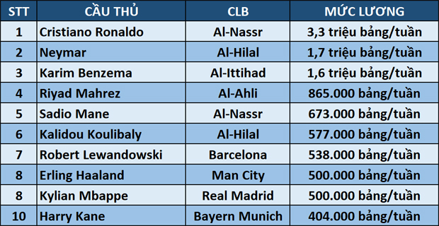 Các ngôi sao hưởng lương cao nhất hiện tại hầu hết đang thi đấu ở Saudi Arabia. Dẫn đầu không ai khác chính là Cristiano Ronaldo với mức lương 3,3 triệu bảng/tuần. Xếp các vị trí tiếp theo lần lượt là Neymar (1,7 triệu bảng/tuần), Karim Benzema (1,6 triệu bảng/tuần), Riyad Mahrez (865 nghìn bảng/tuần), Sadio Mane (673 nghìn bảng/tuần) và Kalidou Koulibaly (577 nghìn bảng/tuần).