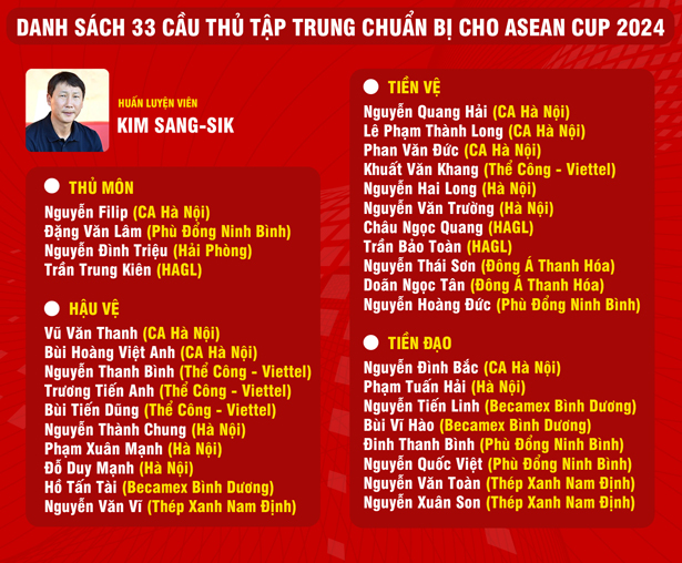 Với 33 cầu thủ đang tập trung, đội tuyển Việt Nam sẽ phải loại 7 cầu thủ để chốt danh sách tham dự ASEAN Cup 2024. |
