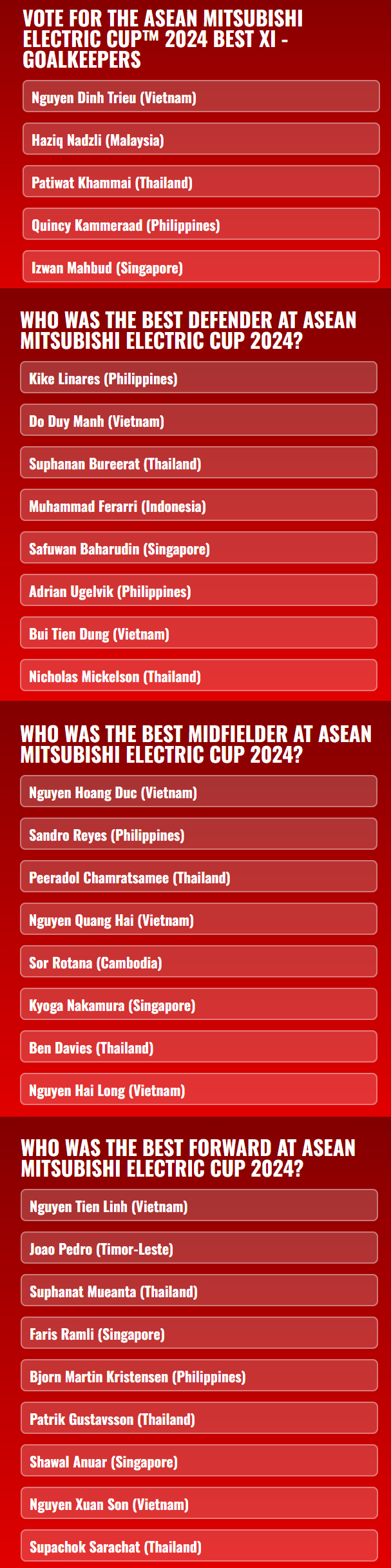 ![]() ĐT Việt Nam có 8 cầu thủ được đề cử đội hình xuất sắc nhất ASEAN Cup 2024 Sau khi ASEAN Cup 2024 hạ màn, trang chủ của giải đấu đã tổ chức bình chọn đội hình xuất sắc nhất cho 4 vị trí là thủ môn, hậu vệ, tiền vệ, tiền đạo. Với chức vô địch, không bất ngờ khi ĐT Việt Nam có 8 cầu thủ góp mặt trong danh sách đề cử. Ở vị trí thủ môn, Đình Triệu đương nhiên góp mặt bởi anh là 1 trong những thủ môn để lọt lưới ít nhất, giúp Việt Nam giành chức vô địch với chiến tích bất bại. Ở lễ trao giải tại Rajamangala, Đình Triệu thậm chí còn được vinh danh với giải thủ môn xuất sắc nhất. Ở vị trí hậu vệ, ĐT Việt Nam có 2 cầu thủ được đề cử là Đỗ Duy Mạnh và Bùi Tiến Dũng. NHM bóng đá Việt Nam tỏ vẻ không hài lòng khi ban tổ chức bỏ quên nhân tố rất quan trọng ở hàng thủ của HLV Kim Sang-sik là Nguyễn Thành Chung. Đây là 1 trong những cầu thủ thi đấu thường xuyên nhất và giữ phong độ ổn định nhất của ĐT Việt Nam. Trong khi đó, ở hàng tiền vệ, ĐT Việt Nam có 3 cầu thủ được đề cử là Nguyễn Hoàng Đức, Nguyễn Quang Hải và Nguyễn Hai Long. Trên mạng xã hội, NHM bóng đá Việt Nam đã phản ứng vì danh sách này thiếu vắng Doãn Ngọc Tân, cầu thủ được ví là “máy quét” của ĐT Việt Nam ở ASEAN Cup 2024. Trên hàng tiền đạo, Xuân Son và Tiến Linh là 2 cầu thủ của ĐT Việt Nam được đề cử. Trong đó, Xuân Son đã giành cú đúp giải cá nhân là Vua phá lưới và Cầu thủ xuất sắc nhất. Tiến Linh không đá chính thường xuyên ở ASEAN Cup 2024 nhưng vẫn ghi dấu ấn với 4 bàn thắng. Dù thua ở chung kết nhưng Thái Lan cũng có 8 cầu thủ lọt danh sách đề cử đội hình xuất sắc nhất ASEAN Cup 2024 là Khammai (thủ môn), Suphanan, Mickelsson (hậu vệ), Peeradon, Ben Davies (tiền vệ), Suphanat, Gustavsson và Supachok (tiền đạo). Dựa vào kết quả bình chọn trên trang chủ, ASEAN Cup 2024 sẽ sớm công bố đội hình xuất sắc nhất. Ở giải đấu năm 2022, ĐT Việt Nam có 4 cầu thủ được vinh danh là Văn Lâm, Văn Hậu, Hoàng Đức và Tiến Linh. DANH SÁCH CÁC ĐỀ CỬ ĐỘI HÌNH XUẤT SẮC NHẤT ASEAN CUP 2024 ![]() |