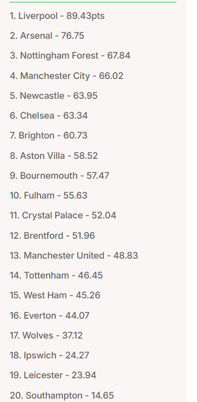 Opta dự đoán Liverpool sẽ kết thúc mùa giải với 89,43 điểm. Điều đó có nghĩa đội bóng áo đỏ vùng Merseyside sẽ kiếm thêm 19,43 điểm trong 9 vòng còn lại. Sở dĩ có điểm số lẻ vì Opta dựa vào phong độ, lịch thi đấu và nhiều yếu tố khác ảnh hưởng tới kết quả của từng vòng.