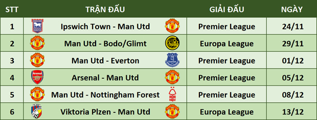 Sau 6 trận đấu này, Man Utd của Ruben Amorim sẽ bước vào trận derby Manchester với Man City. Trận đấu này sẽ diễn ra tại Etihad vào ngày 15/12.