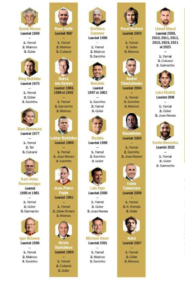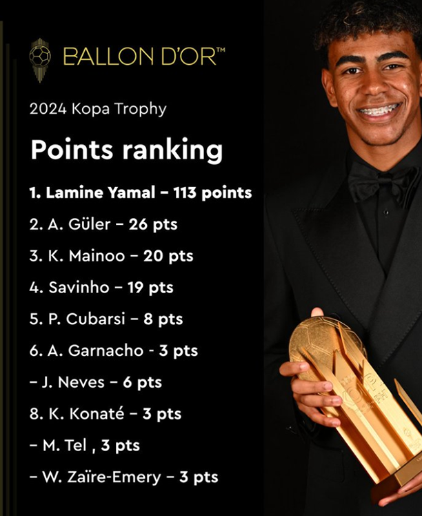 Trong 23 danh thủ và cựu danh thủ từng giành QBV, Người ngoài hành tinh Ronaldo là người duy nhất không cho Lamine Yamal điểm cao nhất trong cuộc bình chọn Kopa Trophy 2024. |