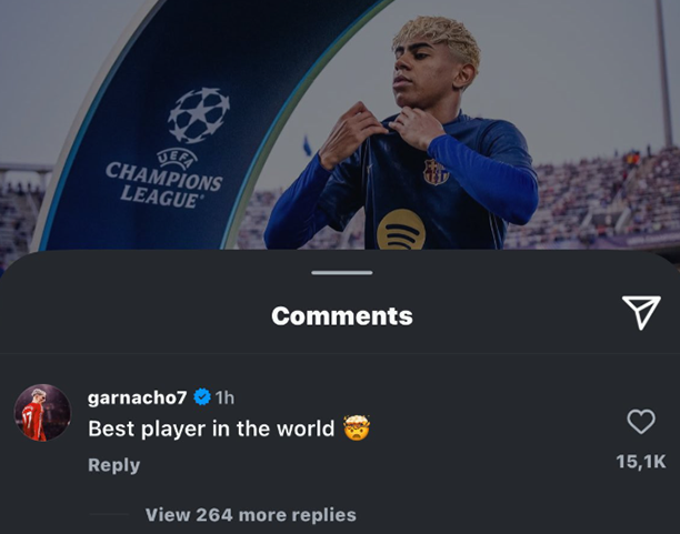Garnacho ngả mũ trước Yamal. Sau khi xem trận hòa 3-3 giữa Barcelona và Inter Milan ở lượt đi vòng bán kết Champions League, Garnacho đã đăng lời khen ngợi Yamal trên X (Twitter). Ngôi sao của M.U bình luận: “Yamal là cầu thủ xuất sắc nhất thế giới”. Tương tự Garnacho, HLV Inzaghi và nhiều cầu thủ Inter Milan cũng đã hết lời ca ngợi Yamal – cầu thủ ghi 1 bàn và có 2 pha dứt điểm trúng xà ngang trong trận đấu này. Riêng Inzaghi, HLV của Inter, cho rằng Yamal là cầu thủ 50 năm mới sinh ra một lần.