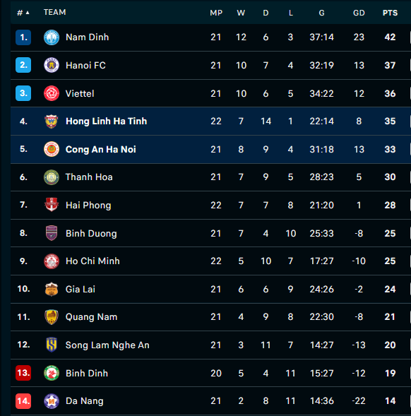 Cuộc đua vô địch V-League mùa này coi như đã chấm hết với CAHN sau khi đội bóng của Polking bị Hà Tĩnh cầm hòa ở vòng 22. Họ kém đội đầu bảng Nam Định tới 9 điểm trong khi mùa giải chỉ còn 5 vòng đấu. |
