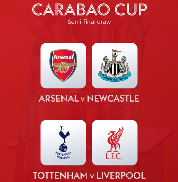 Rạng sáng nay, sau trận tứ kết cuối cùng của Carabao Cup mùa này giữa Tottenham và Man Utd, LĐBĐ Anh (FA) đã tiến hành bốc thăm chia cặp vòng bán kết. Kết quả, Tottenham sẽ gặp Liverpool và cặp đấu còn lại là màn so tài giữa Arsenal và Newcastle.