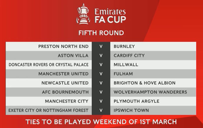 15 trong tổng số 16 trận vòng 4 FA Cup (vòng 1/16) đã kết thúc. Trước 2 trận cuối cùng vòng 4 giữa Doncaster Rovers với Crystal Palace (rạng sáng 11/2) và Exeter City với Nottingham Forest (rạng sáng 12/2), ban tổ chức đã tiến hành lễ bốc thăm phân cặp vòng 5 (vòng 1/8) rạng sáng nay (11/2).