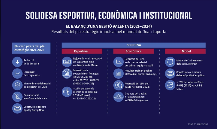 Bất chấp khó khăn trong những năm đầu tiên, Laporta vẫn kiên định với chiến lược của mình. Cho đến nay, khi nhiệm kì chỉ còn 1 năm, vị lãnh đạo 62 tuổi đã thu được 3 thành tựu lớn. Những thành tựu này đã được đội bóng đang dẫn đầu La Liga công bố trên trang chủ.