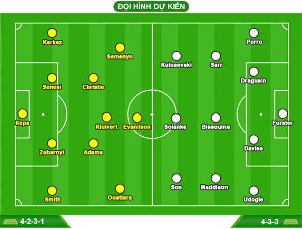- TOTTENHAM: Vắng Micky van de Ven, Wilson Odobert, Richarlison, Mikey Moore, Guglielmo Vicario (chấn thương) và Rodrigo Bentancur (treo giò). Khả năng ra sân của Dominic Solanke, Cristian Romero và Archie Gray còn bỏ ngỏ.