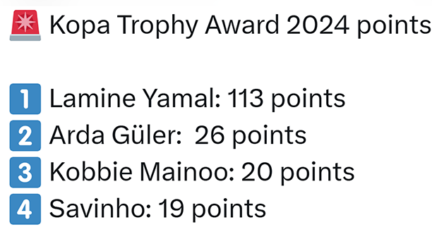 Lamine Yamal bỏ rất xa Arda Guler trong cuộc đua tranh giải Kopa Trophy 2024. |
