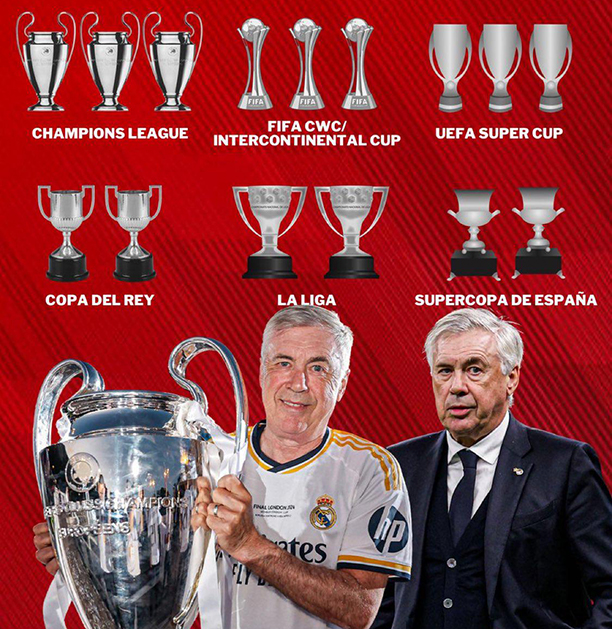 Bảng vàng của HLV Ancelotti ở Real Madrid. Với 15 danh hiệu, ông là HLV thành công nhất lịch sử sân Bernabeu. Không chỉ giúp Kền kền hiện thực hóa giấc mơ La Decima, ông còn giành thêm 2 danh hiệu Champions League khác