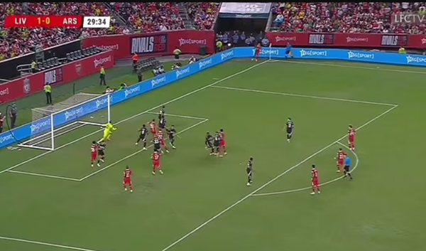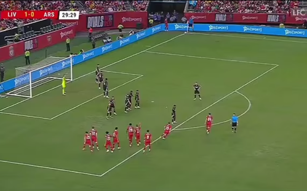 Các CĐV vô cùng ngạc nhiên khi chứng kiến chiến thuật đá phạt góc kì lạ của Liverpool ở trận giao hữu với Arsenal. |