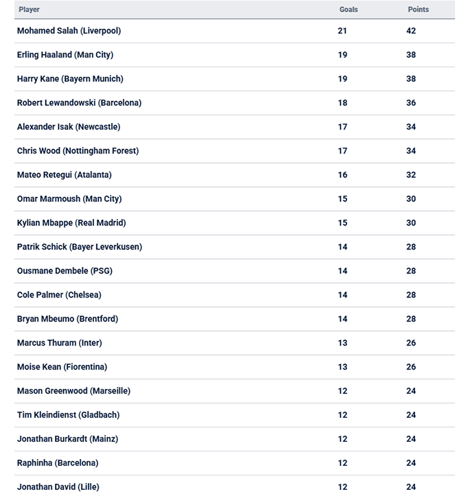 ![]() Salah thi đấu thăng hoa ở mùa giải có thể là cuối cùng với Liverpool Như đã biết, cả Salah, Kane, Haaland và Lewandowski cùng “nổ súng” tại giải VĐQG cuối tuần qua. Trong số này, Salah và Kane lập cú đúp, còn Haaland và Lewy ghi 1 bàn. Với cú đúp ở trận Liverpool thắng Bournemouth 2-0 tại vòng 24 Premier League, Salah đã chạm mốc 25 bàn thắng trên mọi mặt trận mùa này, trong đó có 21 bàn tại Premier League. Nhờ đó tuyển thủ Ai Cập tiếp tục đứng đầu cuộc đua Vua phá lưới giải Ngoại hạng Anh và Chiếc giày vàng châu Âu (Golden Shoe). Đứng đầu cuộc đua Golden Shoe nhưng vị trí của Mo Salah bị Kane và Haaland đe dọa nghiêm trọng. Cùng có 19 bàn tại Bundesliga và Premier League, Kane và Haaland hiện đứng sau Mo Salah trong cuộc đua Golden Shoe với 2 bàn ít hơn. Ngoài Kane và Haaland, Lewandowski cũng có thể chiếm vị trí của Salah bất cứ lúc nào. Với pha xé lưới Espanyol tại vòng 22 La Liga vừa qua, tuyển thủ Ba Lan đã trở thành cầu thủ đầu tiên tại top 5 giải VĐQG hàng đầu châu Âu cán mốc 30 bàn trên mọi mặt trận ở mùa 2024-25. Tính riêng ở La Liga, Lewandowski đã ghi 18 bàn, đứng đầu cuộc đua Vua phá lưới giải VĐQG TBN, đứng thứ ba trong cuộc đua Chiếc giày vàng châu Âu, sau Salah (21 bàn) và Kane cùng Haaland (19 bàn). Trong khi Mo Salah, Kane, Haaland và Lewy cùng “nổ súng” thì Mbappe tịt ngòi ở vòng đấu cuối tuần qua. Với 15 bàn ở La Liga, thủ quân ĐT Pháp đang xếp thứ 6 trong cuộc đua Golden Shoe. BXH GOLDEN SHOE ![]() |