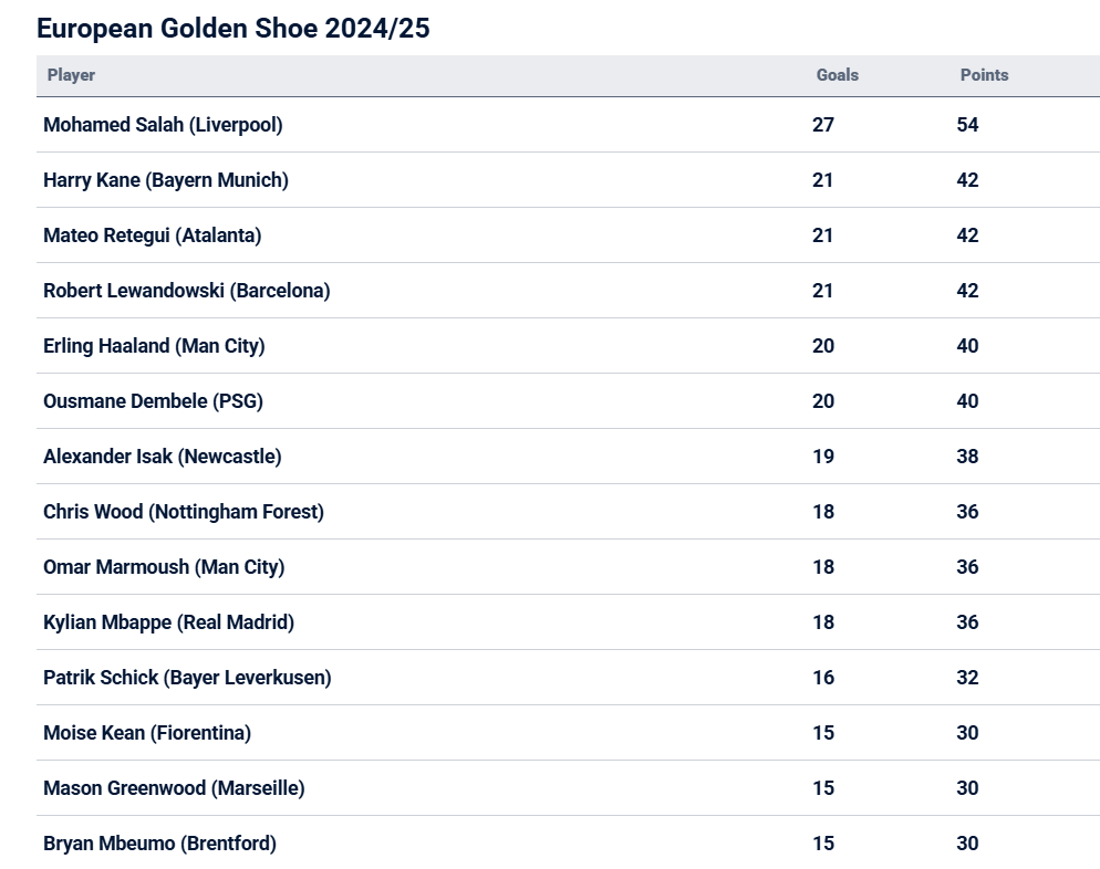 Cụ thể, Mbappe hiện đứng thứ năm trong danh sách ghi bàn cùng với Chris Wood (Nottingham Forest) và Omar Marmoush (Manchester City), cả ba đều ghi 18 bàn tại giải VĐQG. Mbappe bị cầu thủ đứng đầu cuộc đua Golden Shoe là Salah bỏ xa tới 9 bàn (18 so với 27).