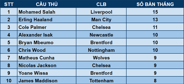 Với cú đúp bàn thắng vào lưới Tottenham, Mohamed Salah đã vươn lên một mình dẫn đầu cuộc đua Vua phá lưới Premier League 2024-25. |