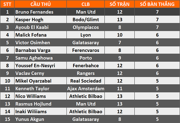 Ngoài ra, có 6 cầu thủ đã ghi 5 bàn thắng ở Europa League mùa này. Trong đó, Nico Williams, Inaki Williams (Bilbao) và Rasmus Hojlund là 3 cầu thủ vẫn còn đang thi đấu ở bán kết.