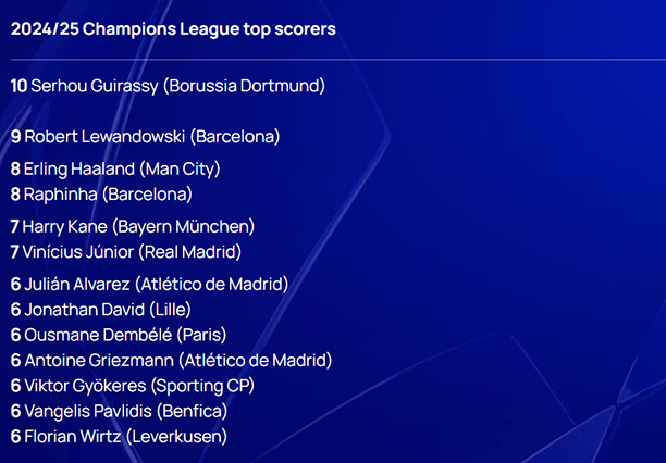 Nhờ phong độ ấn tượng nên Guirassy đã vượt qua Robert Lewandowski để chiếm vị trí dẫn đầu cuộc đua Vua phá lưới UCL mùa này. Đứng sau Guirassy lần lượt là Lewy với 9 bàn thắng.