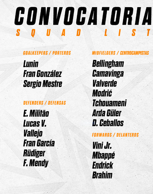 Trong khi Diaz trở lại thì Rodrygo và Courtois không tham gia buổi tập hôm nay, qua đó lỡ El Clasico vì chấn thương. Tương tự Rodrygo và Thibaut Courtois, Carvajal và Alaba cũng vắng mặt do chấn thương dây chằng chéo. Đây là 4 cầu thủ không dự trận Siêu kinh điển, riêng Carvajal, tuyển thủ TBN phải nghỉ hết mùa này.