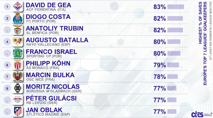 De Gea đang có tỉ lệ cứu thua cao nhất trong top 7 giải VĐQG hàng đầu châu Âu mùa này. |