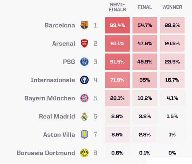 Nhờ chiến thắng với cách biệt 4 bàn, Barca là đội bóng sở hữu cơ hội lọt vào vòng bán kết cao nhất. Theo siêu máy tính của Opta, Barca có 99,4% khả năng đi tiếp.
