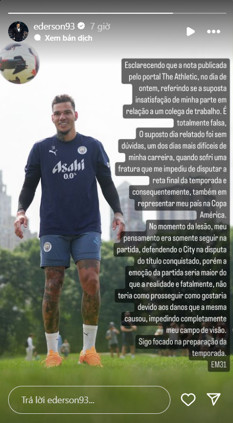 ![]() Giữa Ederson và Ortega hoàn toàn không có xích mích Trong thời gian qua, theo truyền thông Anh, Ederson muốn rời Man City sau 7 năm gắn bó. Ở diễn biến mới nhất, The Athletic tiết lộ nguyên nhân dẫn đến quyết định bất ngờ của thủ môn 30 tuổi bắt nguồn từ Stefan Ortega, thủ môn số 2 của The Citizens. Cụ thể, theo The Athletic, Ederson khó chịu khi Ortega liên tục được khen ngợi sau trận gặp Tottenham ở vòng 34 Premier League mùa trước. Ở trận đấu đó, Ederson dính chấn thương nên phải nhường chỗ cho Ortega. Thủ môn người Đức sau đó đã thực hiện pha cứu thua quan trọng khi đối mặt Heung-min, giúp Man City bảo toàn chiến thắng, qua đó hướng đến chức vô địch EPL thứ 4 liên tiếp. Trước những thông tin tiêu cực về mình, Ederson buộc phải làm rõ mọi chuyện. Thủ môn 30 tuổi viết trên story Instagram: “Tôi muốn làm rõ thông tin được The Athletic đăng tải vào hôm qua. Thông tin này nói tôi không hài lòng với 1 đồng nghiệp. Điều đó hoàn toàn sai sự thật. Ngày được thông tin trên nhắc đến là một trong những ngày tồi tệ nhất trong sự nghiệp của tôi. Tôi đã bị gãy xương, không thể chơi giai đoạn cuối của mùa giải, sau đó không thể cùng Brazil tham dự Copa America. Ở thời điểm dính chấn thương, tôi muốn tiếp tục thi đấu, giúp Man City bảo vệ chức vô địch. Cảm xúc đã lấn át lí trí của tôi lúc đó, đây là điều không thể tránh khỏi. Dù vậy, tôi không thể tiếp tục thi đấu vì chấn thương khiến tôi gặp khó khi quan sát. Giờ đây, tôi chỉ tập trung chuẩn bị cho mùa giải mới”. Bên cạnh đó, vợ của Ederson, Lais Moraes, cũng đã đăng trên Instagram để làm rõ thông tin từ The Athletic. “Trước hết, hãy tìm nguồn tin tốt hơn. Thông tin vừa rồi hoàn toàn sai sự thật”, Lais viết. Với phản ứng trên, có thể Ederson sẽ không rời Man City trong hè này như đồn đoán. Tuy nhiên, theo nhiều nguồn tin uy tín, The Citizens đã ra giá 50-60 triệu bảng cho Ederson. Ngoài ra, Pep Guardiola cũng trả lời lấp lửng về thủ thành này ở buổi phỏng vấn gần nhất: “Tôi muốn cậu ấy ở lại, nhưng điều đó còn phụ thuộc vào các CLB khác”. Do đó, tương lai của Ederson tại Etihad vẫn chưa được đảm bảo. ![]() |