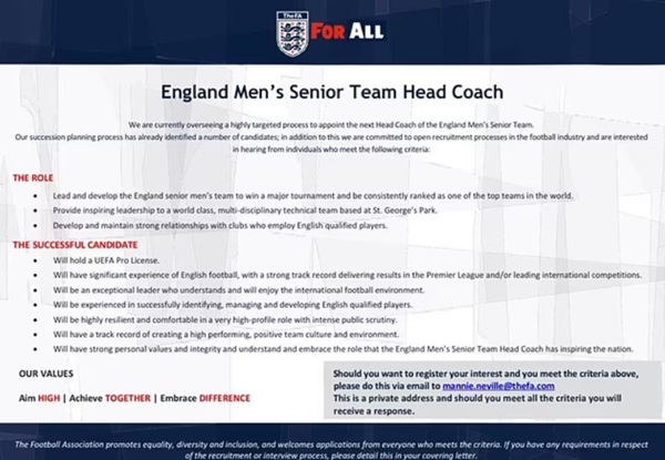 LĐBĐ Anh (FA) đã bất ngờ đăng tin tuyển dụng HLV mới trên trang chủ sau khi chia tay Gareth Southgate. |