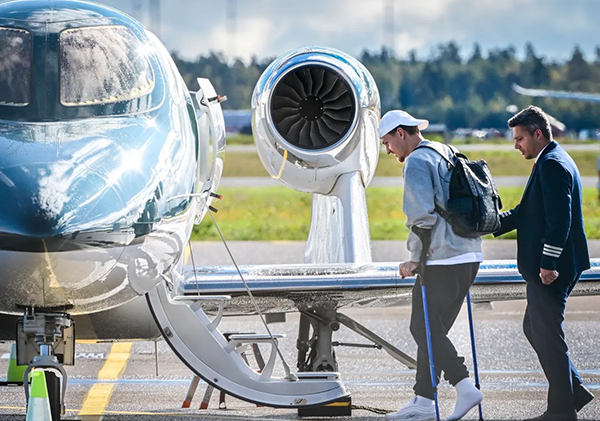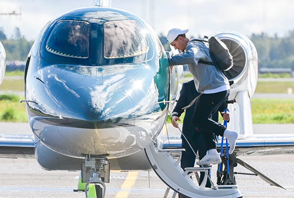 Tiền vệ Martin Odegaard vừa được thấy phải tập tễnh chống nạng lên chuyến bay về London. |