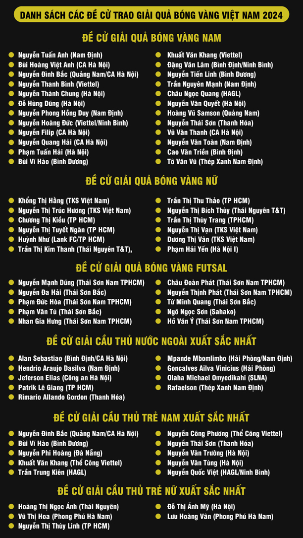 Rất khó để dự đoán cầu thủ nào sẽ giành danh hiệu Quả bóng Vàng Việt Nam 2024 sau thành công ở ASEAN Cup 2024. |